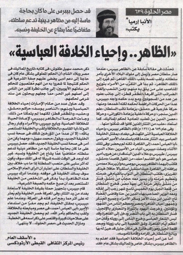وفي عام 659هـ (1261م) قام “الظاهر بيبرس” بإحياء الخلافة العباسية التي انتهت في “بغداد” بمقتل الخليفة العباسي بيد التتار عندما قام باستدعاء الأمير العباسي “أبا العباس أحمد” إلى القاهرة، لكنه لم يحضر؛ وفي تلك الأثناء وصلت “بيبرس” أنباء من الأميرين “علاء الدين بيبرس/طيبرس” و”علاء الدين البندقدار” عن هروب أمير عباسي هو “أبو القاسم أحمد” من المغول قاصدًا “دمشق”، فكتب إليهما “الظاهر بيبرس” يوصي به وأن يرسلا معه من يرافقه إلى القاهرة حيث استُقبِلَ استقبالاً حافلاً، فيذكر المقريزي: “فَكتب السُّلْطَان إِلَى النُّوَّابِ بِالْقيامِ فِي خِدمَتِهِ وَتَعْظِيمِ حُرْمَتِهِ وَأَن يِسِيرَ مَعَه حِجَابٌ مِنْ دِمَشْقَ، فَسَار مِنْ دِمَشْقَ بِأَوْفَرَ حُرْمَةٍ إِلَى جِهَة مِصْرَ. فَخرج السُّلْطَان من قلعة الْجَبَل يَوْم الْخَمِيس تَاسِع شهر رَجَب إِلَى لِقَائِه وَمَعَهُ الْوَزير الصاحب بهاء الدّين بن حنا وقاضي الْقُضَاة تَاج الدّين ابْن بنت الأَعَز وَسَائِر الأُمَرَاء وَجَمِيع الْعَسْكَر وَجُمْهُور أَعْيَان الْقَاهِرَة ومصر ومعظم النَّاس من الشُّهُود والمؤذنين. وَخرجت الْيَهُود بِالتَّوْرَاةِ وَالنَّصَارَى بالإنجيل. فَسَار السُّلْطَان بِهِ إِلَى بَاب النَّصْر وَدخل إِلَى الْقَاهِرَة وَقد لبس الشعار العباسي وَخرج النَّاس إِلَى رويته وَكَانَ من أعظم أَيَّام الْقَاهِرَة. وشق القصبة إِلَى بَاب زويلة وَصعد قلعة الْجَبَل وَهُوَ رَاكب فَأنْزل فِي مَكَان جليل قد هيئ لَهُ بهَا وَبَالغ السُّلْطَان فِي إكرامه وَإِقَامَة ناموسه”.