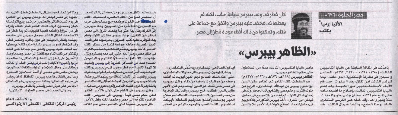 تحدَّثت في المقالة السابقة عن “البابا أثناسيوس الثالث” (1250/ 1251م- 1261/ 1262م) السادس والسبعين في بطاركة الإسكندرية؛ الذي خلف “البابا كيرلس الثالث ابن لقلق” بعد 7 سنوات؛ حيث قام الآباء الأساقفة بتدبير أمور الكنيسة. وقد اهتم “البابا أثناسيوس الثالث” بإصلاح ما أفسده سلفه حتى تنيح عام 1262م، بعد أن جلس بطريركًا مدة 11 سنة وشهر واحد. وقد خلفه على الكرسي السكندري “البابا يوحنا السابع”، و”البابا غبريال الثالث”. وقد عاصر “البابا أثناسيوس الثالث” عددًا من السلاطين حتى حكم “الظاهر بيبرس”.