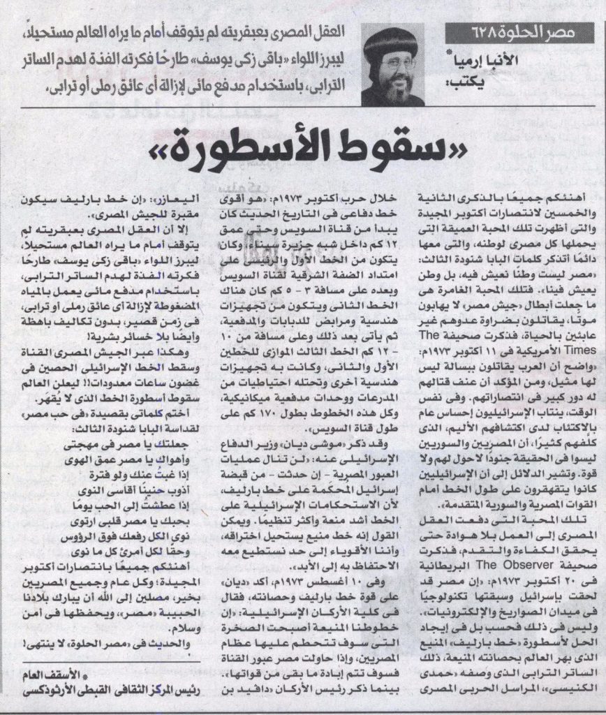 أهنئكم جميعًا بالذكرى الثانية والخمسين لانتصارات أكتوبر المجيدة والتي أظهرت تلك المحبة العميقة التي يحملها كل مصري لوطنه، والتي معها دائمًا أتذكر كلمات البابا شنوده الثالث: “مصر ليست وطنًا نعيش فيه، بل وطن يعيش فينا”. فتلك المحبة الغامرة هي ما جعلت أبطال “جيش مصر” لا يهابون موتًا، يقاتلون بضراوة عدوهم غير عابئين بالحياة، فذكرت صحيفةThe Timesالأمريكية في 11 أكتوبر 1973م: “واضح أن العرب يقاتلون ببسالة ليس لها مثيل، ومن المؤكد أن عنف قتالهم له دور كبير في انتصاراتهم. وفي نفس الوقت، ينتاب الإسرائيليون إحساسًا عامًّا بالاكتئاب لدى اكتشافهم الأليم، الذي كلَّفهم كثيرًا، أن المصريين والسوريين ليسوا في الحقيقة جنودًا لاحول لهم ولا قوة. وتشير الدلائل إلى أن الإسرائيليين كانوا يتقهقرون على طول الخط أمام القوات المصرية والسورية المتقدمة”.