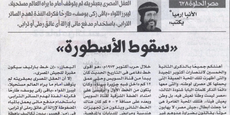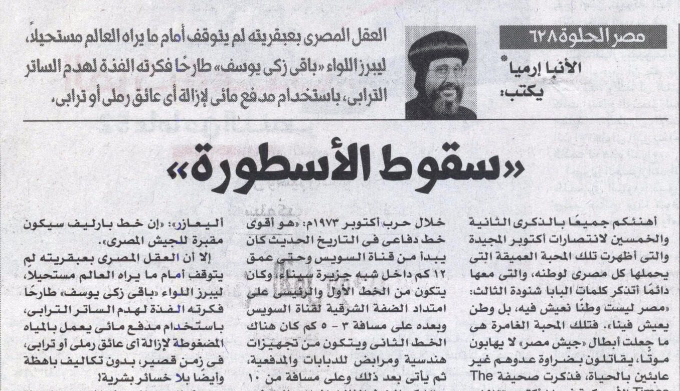 أهنئكم جميعًا بالذكرى الثانية والخمسين لانتصارات أكتوبر المجيدة والتي أظهرت تلك المحبة العميقة التي يحملها كل مصري لوطنه، والتي معها دائمًا أتذكر كلمات البابا شنوده الثالث: “مصر ليست وطنًا نعيش فيه، بل وطن يعيش فينا”. فتلك المحبة الغامرة هي ما جعلت أبطال “جيش مصر” لا يهابون موتًا، يقاتلون بضراوة عدوهم غير عابئين بالحياة، فذكرت صحيفةThe Timesالأمريكية في 11 أكتوبر 1973م: “واضح أن العرب يقاتلون ببسالة ليس لها مثيل، ومن المؤكد أن عنف قتالهم له دور كبير في انتصاراتهم. وفي نفس الوقت، ينتاب الإسرائيليون إحساسًا عامًّا بالاكتئاب لدى اكتشافهم الأليم، الذي كلَّفهم كثيرًا، أن المصريين والسوريين ليسوا في الحقيقة جنودًا لاحول لهم ولا قوة. وتشير الدلائل إلى أن الإسرائيليين كانوا يتقهقرون على طول الخط أمام القوات المصرية والسورية المتقدمة”.