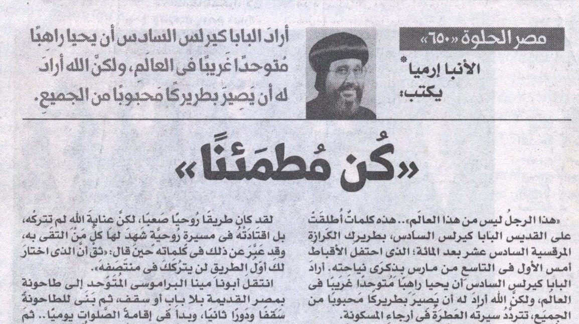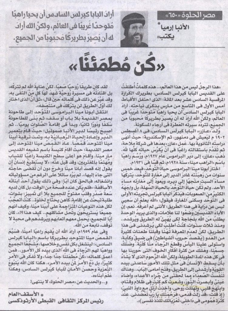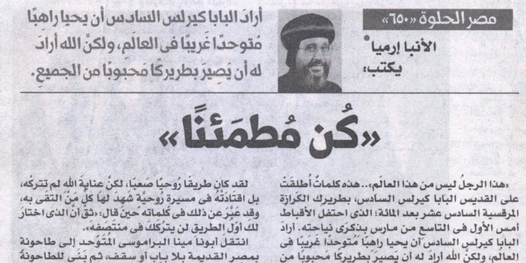 «هذا الرجلُ ليس من هذا العالَمِ».. هذه كلماتٌأُطلِقَتْ على القديس البابا كيرلس السادس، بطريرك الكرازة المرقسية السادس عشر بعد المئة؛ الذي احتفلَالأقباطُأمس الأول في التاسعِ من مارس بذِكرَى نياحتِه. أرادَ البابا كيرلس السادس أن يحيا راهِبًا مُتوحدًا غَريبًا في العالَمِ، ولكنَّ الله أرادَ له أن يَصِيرَ بطريركًا مَحبوبًا من الجميعِ، تتردَّدُ سيرتُه العَطِرَةُ في أرجاءِ المسكونةِ.