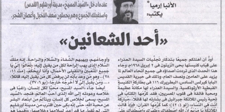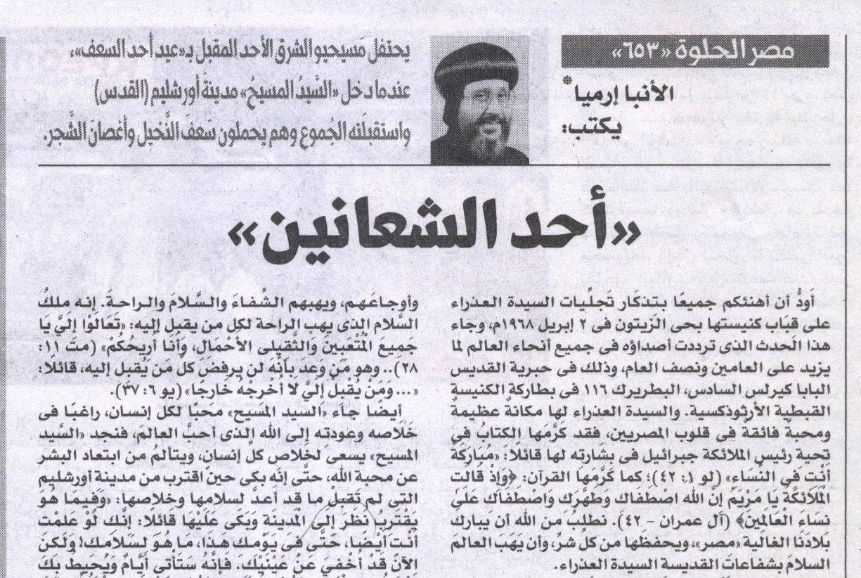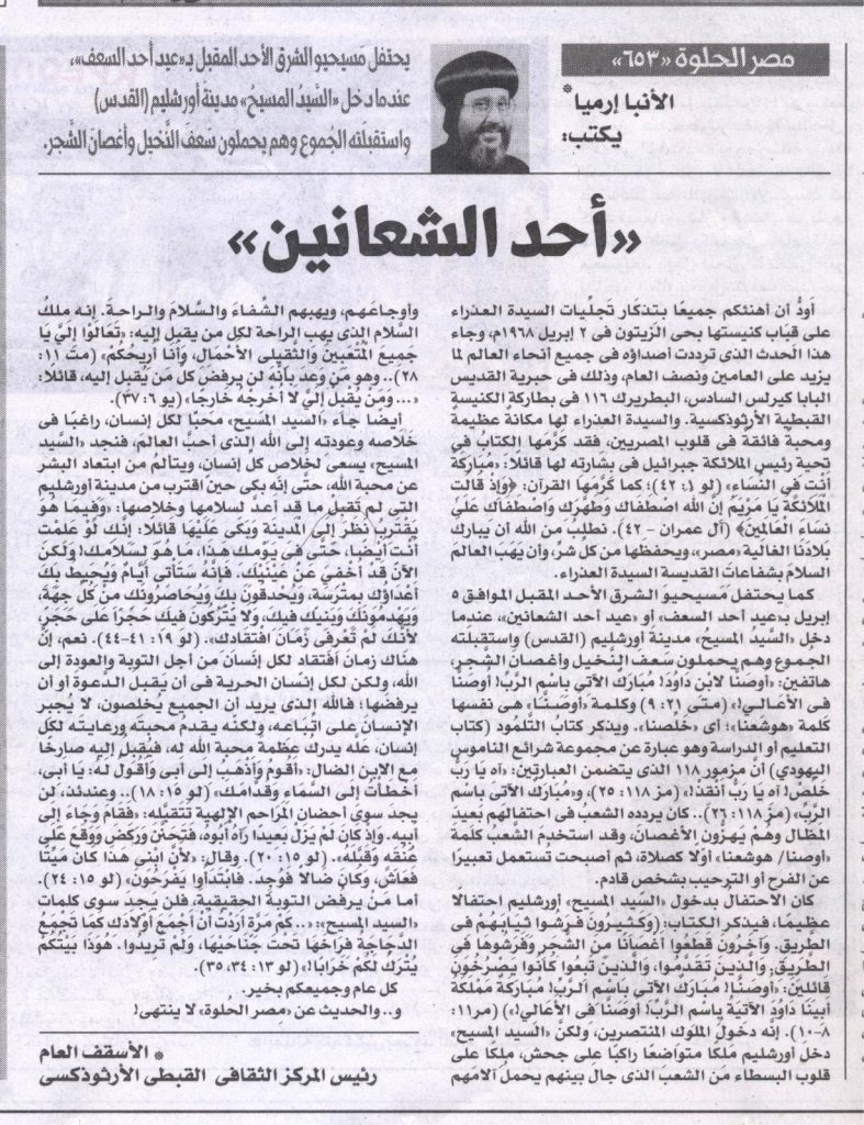 أَودُّ أن أهنئكم جميعًا بتِذكَار تَجلِّيات السيدة العذراء على قِبَاب كنيستها بحي الزيتون في 2 إبريل 1968م، وجاء هذا الحدث الذي ترددت أصداؤه في جميع أنحاء العالم لما يزيد على العامين ونصف العام، وذلك في حبرية القديس البابا كيرلس السادس، البطريرك 116 في بطاركة الكنيسة القبطية الأرثوذكسية. والسيدة العذراء لها مكانةٌ عظيمةٌ ومحبةٌ فائقةٌ في قلوب المصريين، فقد كَرَّمَها الكِتابُ في تحيةِ رئيس الملائكة جبرائيل في بِشَارتِه لها قائلًا: «مُبَارَكَةٌ أَنْتِ فِي ٱلنِّسَاءِ» (لو 1: 42)؛ كما كرَّمَها القرآن: ﴿وَإِذْ قَالَتِ الْمَلَائِكَةُ يَا مَرْيَمُ إِنَّ اللَّهَ اصْطَفَاكِ وَطَهَّرَكِ وَاصْطَفَاكِ عَلَىٰ نِسَاءِ الْعَالَمِينَ﴾، (آل عمران – 42). نطلبُ من الله أن يباركَ بلادَنا الغالية «مِصر»، ويحفظَها من كلِّ شرِّ، وأن يَهَبَ العالمَ السلامَبشفاعاتِ القديسةِ السيدة العذراء.