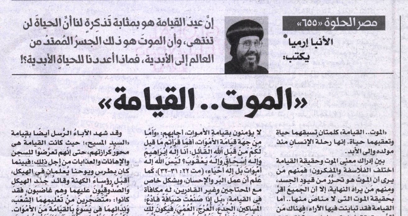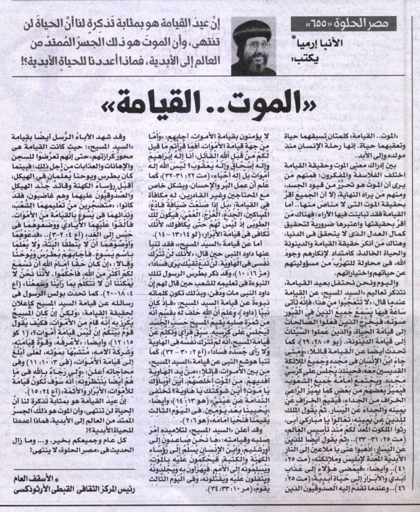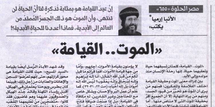 واليوم ونحن نحتفل بعيد القيامة، نتذكّر تعاليم «السيد المسيح» عن القيامة عندما قال: «لَا تَتَعَجَّبُوا مِنْ هَذَا، فَإِنَّهُ تَأْتِي سَاعَةٌ فِيهَا يَسْمَعُ جَمِيعُ الَّذِينَ فِي الْقُبُورِ صَوْتَهُ، فَيَخْرُجُ الَّذِينَ فَعَلُوا الصَّالِحَاتِ إِلَى قِيَامَةِ الْحَيَاةِ، وَالَّذِينَ عَمِلُوا السَّيِّئَاتِ إِلَى قِيَامَةِ الدَّيْنُونَةِ». (يو 5: 28، 29)، كما تحدّث أيضًا عن القيامة قائلًا: «وَمَتَى جَاءَ ابْنُ الإِنْسَانِ فِي مَجْدِهِ وَجَمِيعُ الْمَلاَئِكَةِ الْقِدِّيسِينَ مَعَهُ، فَحِينَئِذٍ يَجْلِسُ عَلَى كُرْسِيِّ مَجْدِهِ. وَيَجْتَمِعُ أَمَامَهُ جَمِيعُ الشُّعُوبِ، فَيُمَيِّزُ بَعْضَهُمْ مِنْ بَعْضٍ كَمَا يُمَيِّزُ الرَّاعِي الْخِرَافَ مِنَ الْجِدَاءِ، فَيُقِيمُ الْخِرَافَ عَنْ يَمِينِهِ وَالْجِدَاءَ عَنِ الْيَسَارِ. ثُمَّ يَقُولُ الْمَلِكُ لِلَّذِينَ عَنْ يَمِينِهِ: تَعَالَوْا يَا مُبَارَكِي أَبِي، رِثُوا الْمَلَكُوتَ الْمُعَدَّ لَكُمْ مُنْذُ تَأْسِيسِ الْعَالَمِ» (مت 25: 31- 33).. «ثُمَّ يَقُولُ أَيْضًا لِلَّذِينَ عَنِ الْيَسَارِ: اذْهَبُوا عَنِّي يَا مَلاَعِينُ إِلَى النَّارِ الأَبَدِيَّةِ الْمُعَدَّةِ لإِبْلِيسَ وَمَلاَئِكَتِهِ» (مت 25: 41).. وأيضًا: «فَيَمْضِي هَؤُلاَءِ إِلَى عَذَابٍ أَبَدِيٍّ وَالأَبْرَارُ إِلَى حَيَاةٍ أَبَدِيَّةٍ» (مت 25: 46)..وعندما تقدَّمَ إليه الصدُّوقِيُّونَ الذين لا يؤمنون بقيامة الأموات، أجابهم: «وَأَمَّا مِنْ جِهَةِ قِيَامَةِ الأَمْوَاتِ، أَفَمَا قَرَأْتُمْ مَا قِيلَ لَكُمْ مِنْ قِبَلِ اللهِ الْقَائِلِ:أَنَا إِلَهُ إِبْرَاهِيمَ وَإِلَهُ إِسْحَاقَ وَإِلَهُ يَعْقُوبَ؟ لَيْسَ اللهُ إِلَهَ أَمْوَاتٍ بَلْ إِلَهُ أَحْيَاءٍ» (مت 22: 31-32)، كما عَلَّم أن عملَ البِّر والإحسان، وبشكل خاص مع المحتاجين وغير القادرين، له مكافأة في القيامة: «بَلْ إِذَا صَنَعْتَ ضِيَافَةً فَادْعُ: الْمَسَاكِينَ، الْجُدْعَ، الْعُرْجَ، الْعُمْيَ، فَيَكُونَ لَكَ الطُّوبَى إِذْ لَيْسَ لَهُمْ حَتَّى يُكَافُوكَ، لأَنَّكَ تُكَافَى فِي قِيَامَةِ الأَبْرَارِ» (لو 14: 13 – 14).
