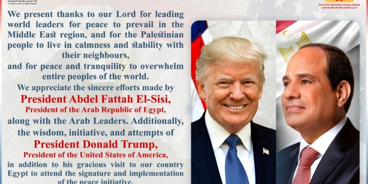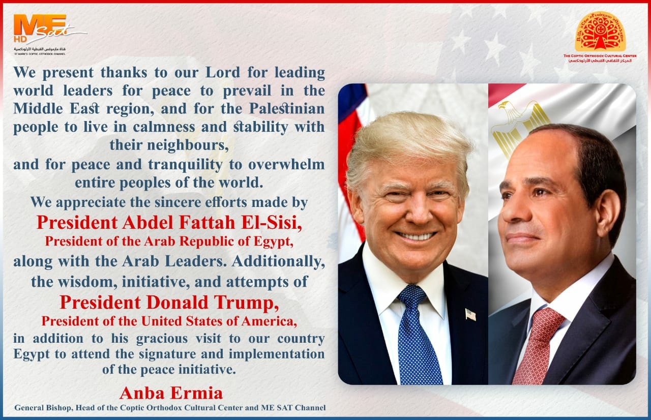 (English) We present thanks to our Lord for leading world leaders for peace to prevail in the Middle East region, and for the Palestinian people to live in calmness and stability with their neighbours, and for peace and tranquility to overwhelm entire peoples of the world. We appreciate the sincere efforts made by President Abdel Fattah El-Sisi, President of the Arab Republic of Egypt, along with the Arab Leaders. Additionally, the wisdom, initiative, and attempts of President Donald Trump, President of the United States of America, in addition to his gracious visit to our country Egypt to attend the signature and implementation of the peace initiative. BishopErmia General Bishop, Head of the Coptic Orthodox Cultural Center and ME SAT Channel