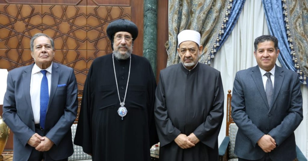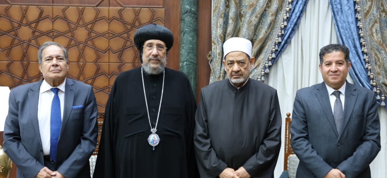 His Eminence the Grand Imam, Dr. Ahmed Al-Tayeb, Sheikh of Al-Azhar Al-Sharif, received today, Sunday, October 12, 2025, at Al-Azhar Headquarters, Dr. Mostafa Abdel-Ghani, Vice President of Al-Azhar University for Girls and Secretary-General of the Egyptian Family House; His Grace Bishop Ermia, General Bishop, Head of the Coptic Orthodox Cultural Center, and Assistant Secretary-General of the Egyptian Family House; and Ambassador Abdelrahman Moussa, Advisor to the Grand Imam for Foreign Relations and Expatriate Affairs.